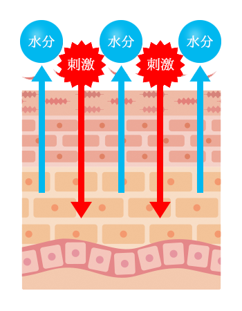 角質が未熟のまま、層を形成してしまうため、層のスキマから水分が逃げてしまい、乾燥・小ジワの原因になります。外部からの刺激も侵入しやすく、様々なお肌トラブルの原因となってしまいます。